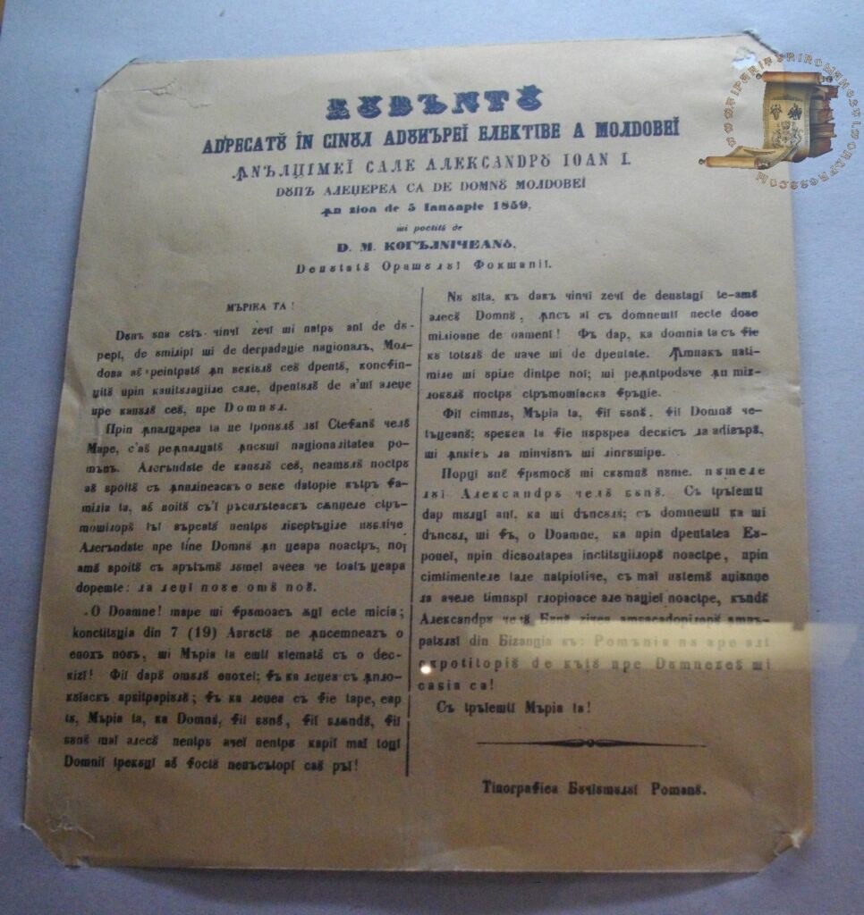 Voința nației, prin legiuitul ei organ, Adunarea electivă, ne-a ales domn al Moldovei. Suindu-se pe tron cu numele de Alexandru Ioan I., cea dintâi datorie a noastră este de a ne adresa către voi, iubiților compatrioți, de a vă dori pace și fericire și de a vă spune cari sunt cugetările și țintirile noastre.